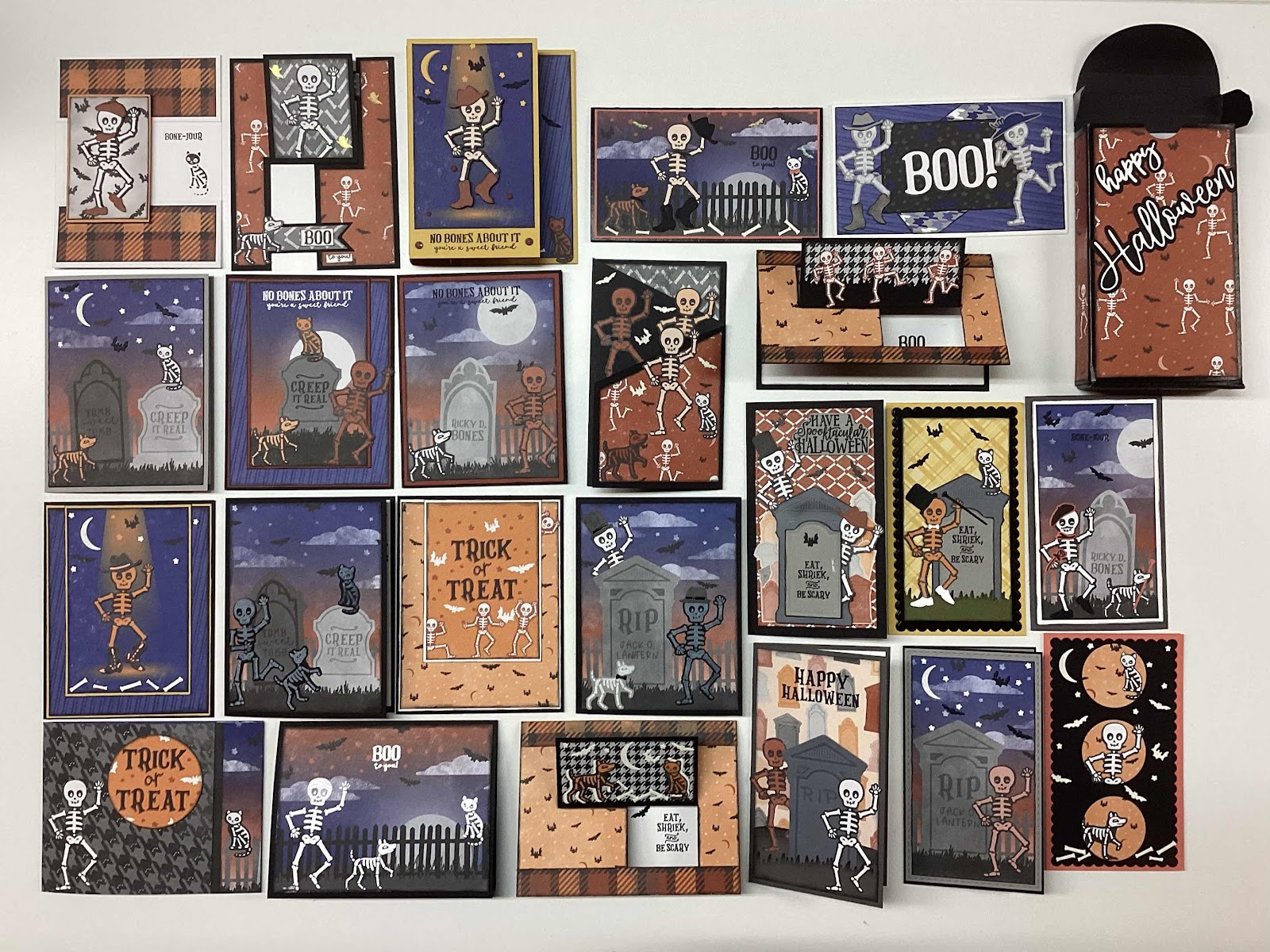 Stampin’ Up! knocked it out of the grave yard this year with stamps, dies, papers & glow in the dark paper and embellishments. The Bag of Bones Stamps and Dies Bundle and Them Bones DSP made short work of this gift set of mini slimline cards. The gift box is the TSOF Mini Slimline Box Die.
