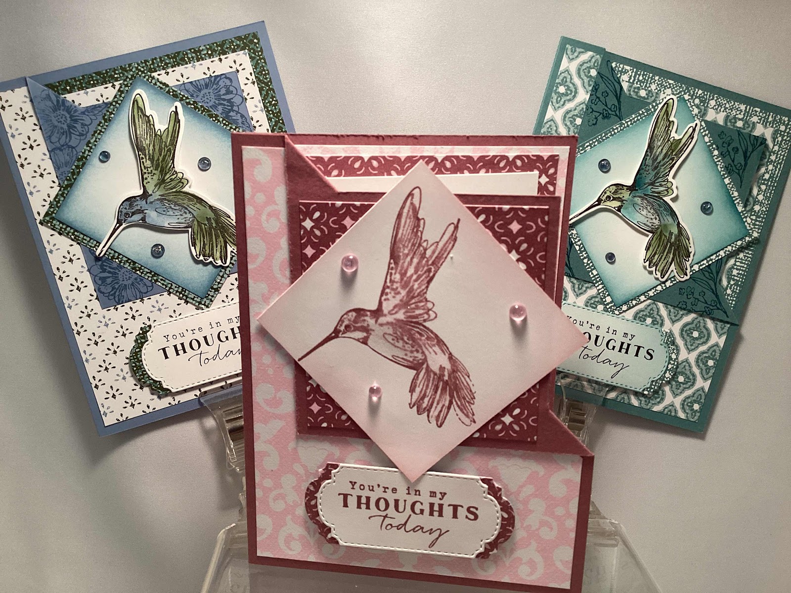 For the Moody Mauve design I simply stamped the hummingbird with Moody Mauve ink and blended it out a bit with the shimmer pen.